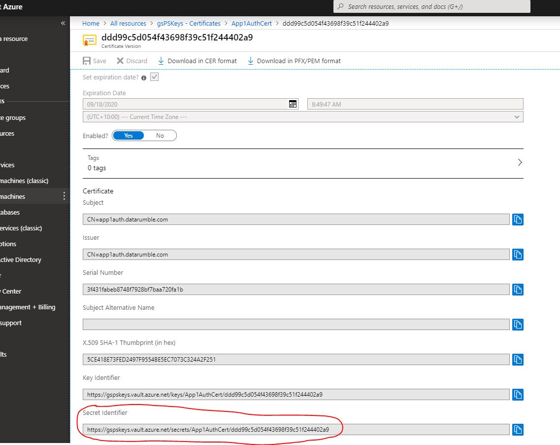 $KeyVaultURL = "https://xxx.vault.azure.net/secrets/App1AuthCert/xxx99c5d054f43698f39c51f24440xxx?api-version=7.0"